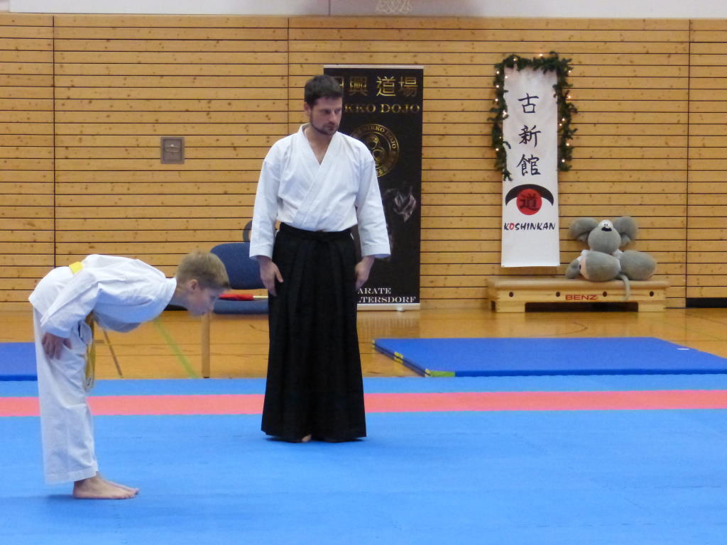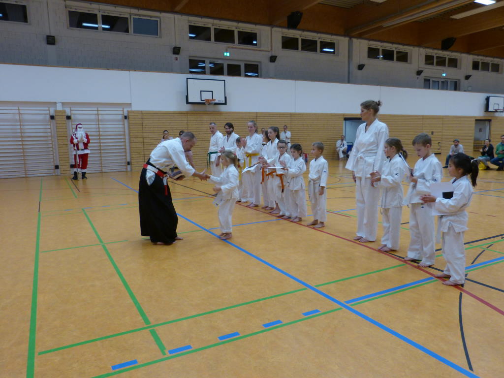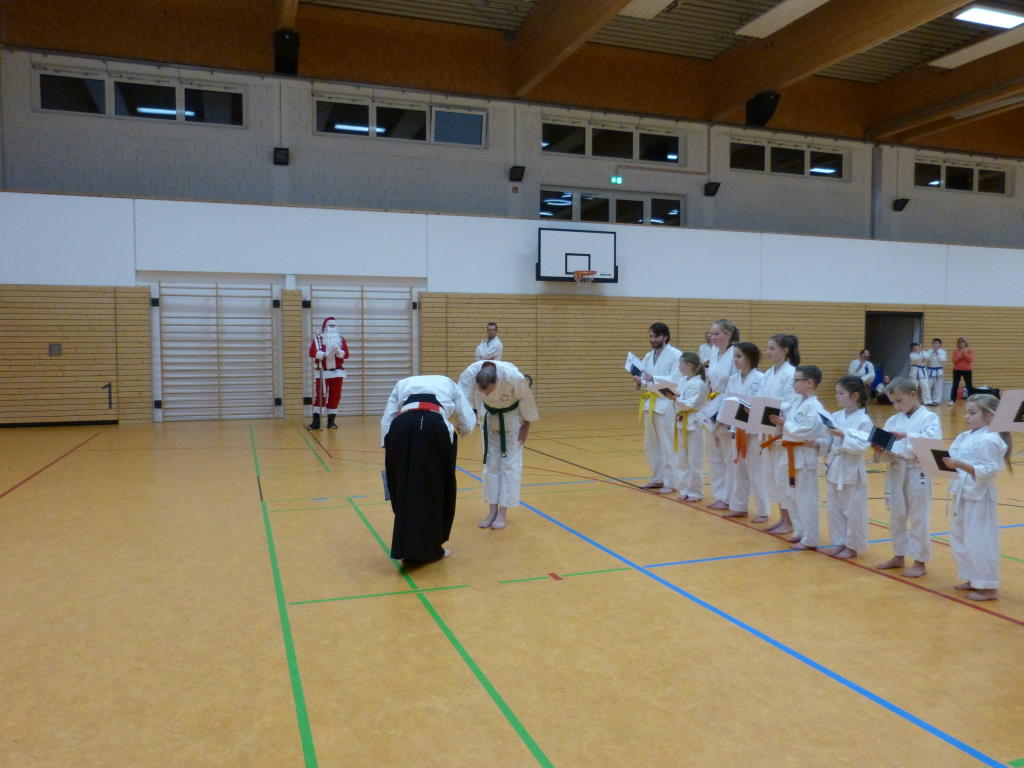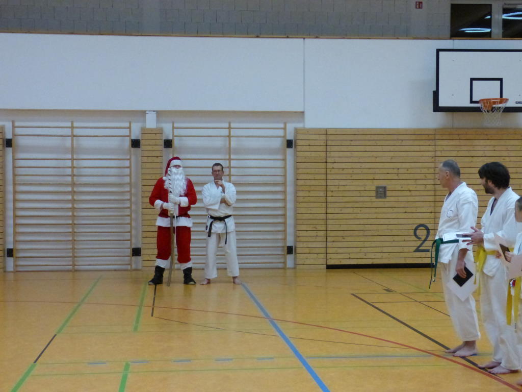 Der Weihnachtsmann kam persönlich schon zum Weihnachtsturnier und überwachte die gesamte Vereinsmeisterschaft. Er prüfte mit seinem scharfen Sinn, ob sich alle Kinder stets korrekt verhalten haben, Höflichkeit untereinander gepflegt haben, zuvorkommend gegenüber Älteren waren und Freundschaftlichkeit im Dojo pflegten.