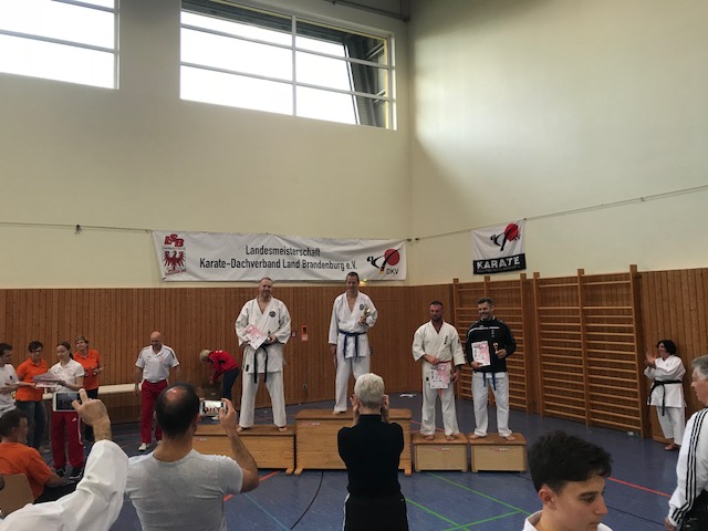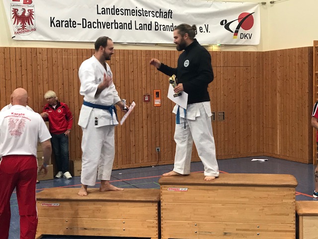 Zeitgleich machten sich Daniel Wallasch und Steffen Dehne für die Präsentation ihrer Katas bereit. Nach längerer Wartezeit und wiederholtem Kaltwerden durften sie dann doch noch antreten und konnten feststellen, wie unterschiedlich Hallenboden gegenüber den Tatami Budomatten sind.